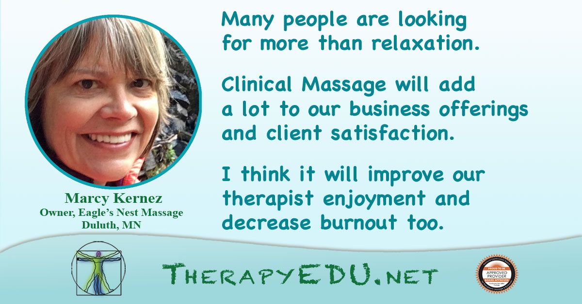 Our Medical Massage program Certifies elite massage therapists as Specialists in Clinical Massage, going beyond basic relaxing Spa-style, Sports, and Deep-tissue massage, to deliver personalized, interactive body care and drug-free pain relief as a high-value, multi-session offering.